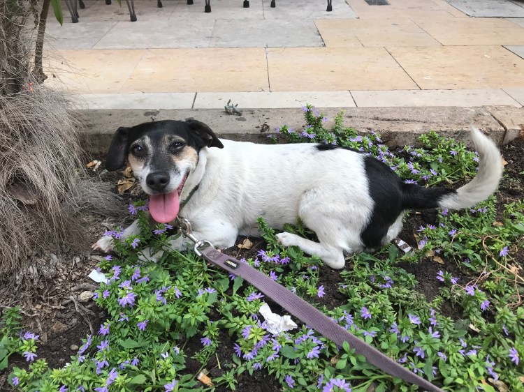 Am nächsten Tag versuchten wir unser Glück erneut, diesmal mit einer Regenjacke und einem Regenschirm. Wir suchten in der Stadt nach Orten, die wir bespielen können, und wir hatten auch ein paar gefunden, aber trauten uns erst nicht zu spielen. Von dem ganzen umherlaufen brauchte Amy eine kleine Pause im Blumenbeet.