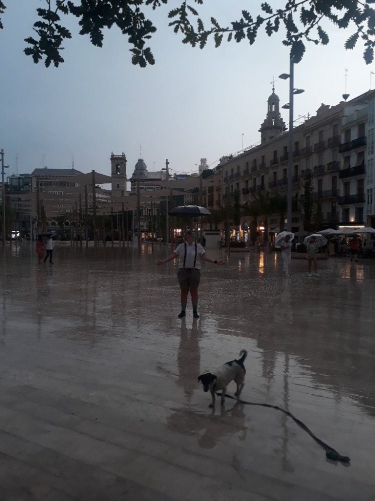 In Valencia haben wir einen -halb legalen- Parkplatz direkt am Strand gefunden, wir müssen nur einmal über die Straße und sind direkt im Mittelmeer. Unser Nachbar ist ein sehr netter Spanier, der uns sehr viel erklärt hat über die spanische Kultur. Am Abend fuhren wir los um unsere erste Show zu spielen… Wenn da nicht das Wetter wäre….Es regnete wie aus Gießkannen und die Show fiel ins Wasser. Und wir mussten uns spontan einen Regenschirm für 4,50€ im Touri-Shop kaufen, weil wir beide nicht auf die Idee kamen Regenjacken mitzunehmen.