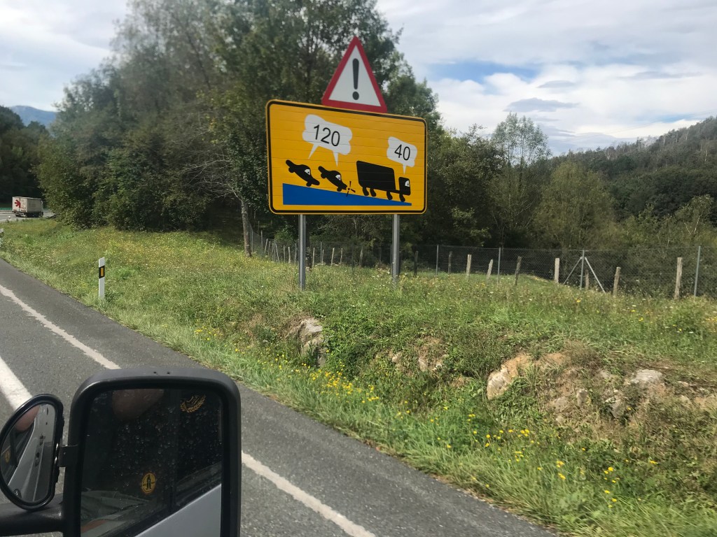 Und dann in Richtung französische Grenze in der Nähe von Irun. Auf dem Weg dorthin dachten wir, dass wir nicht an der Straße parken und übernachten wollen, weil es wie nach einem Straßenrennen aussah. Jedenfalls gab es Absperrungen und ein paar Raser 😉