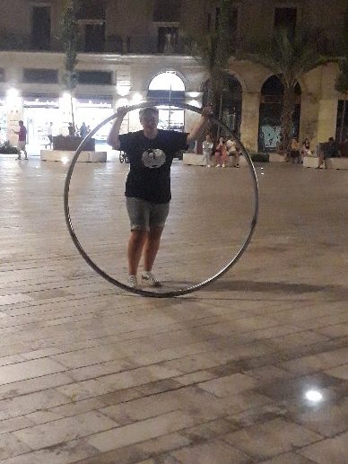 An einem der letzten Abende in Valencia haben wir zusammen mit Maurice und Tamara noch mitten in der Nacht auf einem der großen Plätze mit unseren Sachen gespielt und da entstand auch dieses Bild wie wir Cyr-Wheel probierten. Jedenfalls von einem von uns 😉