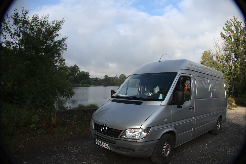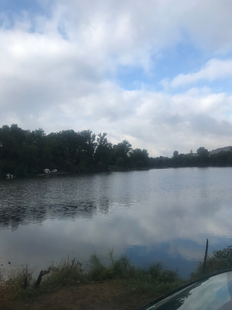 Nach kurzer Überlegung dachten wir uns dann: „Atlantik und Herbst sind wohl nicht so gut für unsere Straßenkunst – also Richtung Côte d’azur!“ Soweit der erste Plan 🙂 Und die Richtung führte uns erstmal zu einem ruhigen Plätzchen zum Schlafen an einem „See“ – jedenfalls nach der Karte. Aber der war so ausgetrocknet und flach, dass es eher eine Grasfläche umgeben von einem Damm war 😀