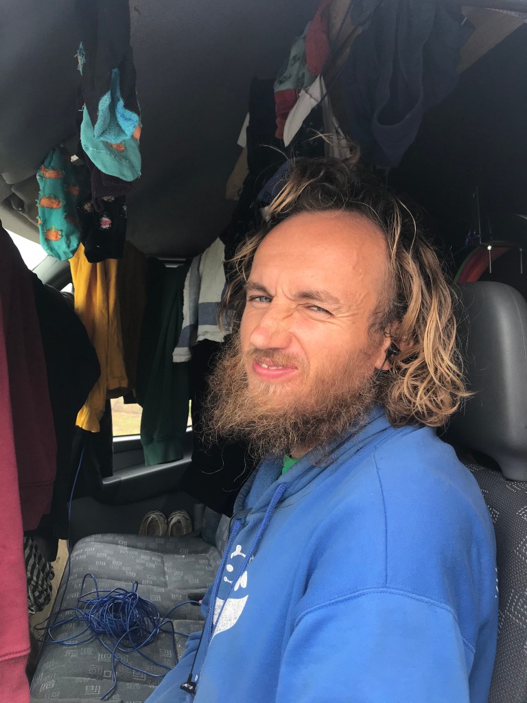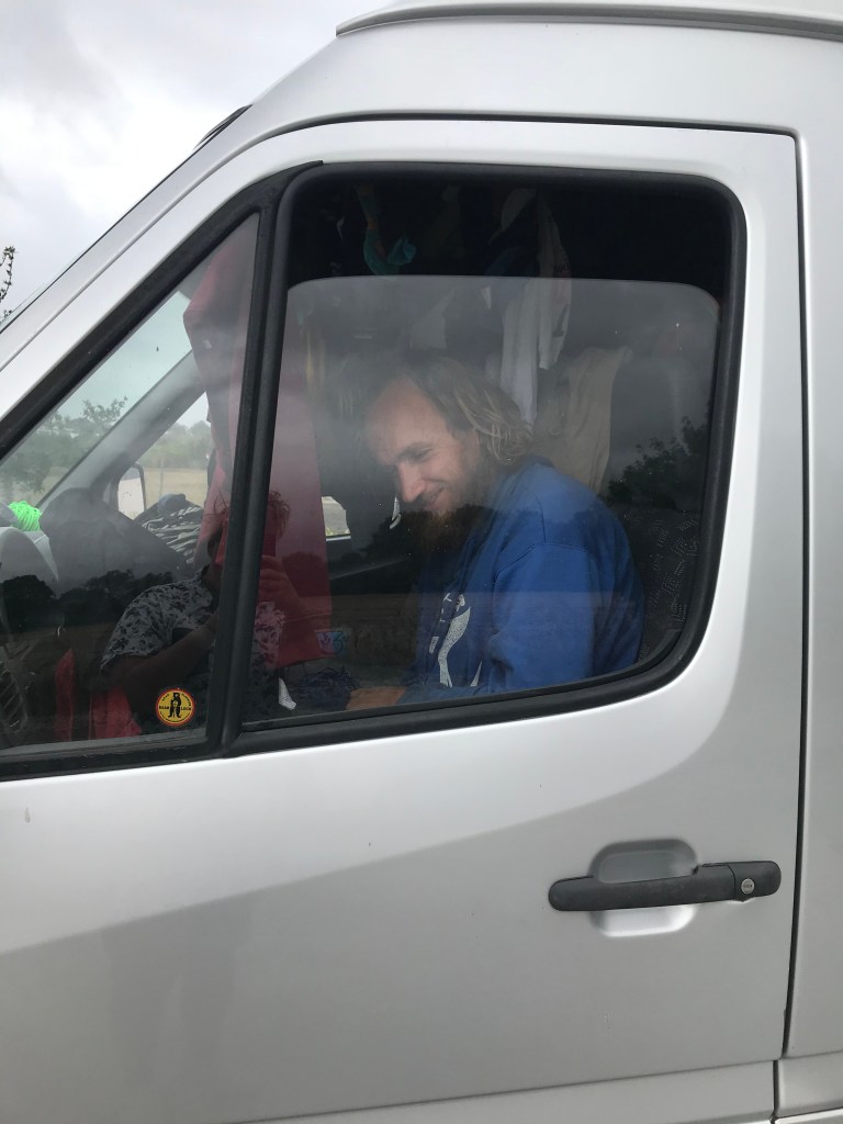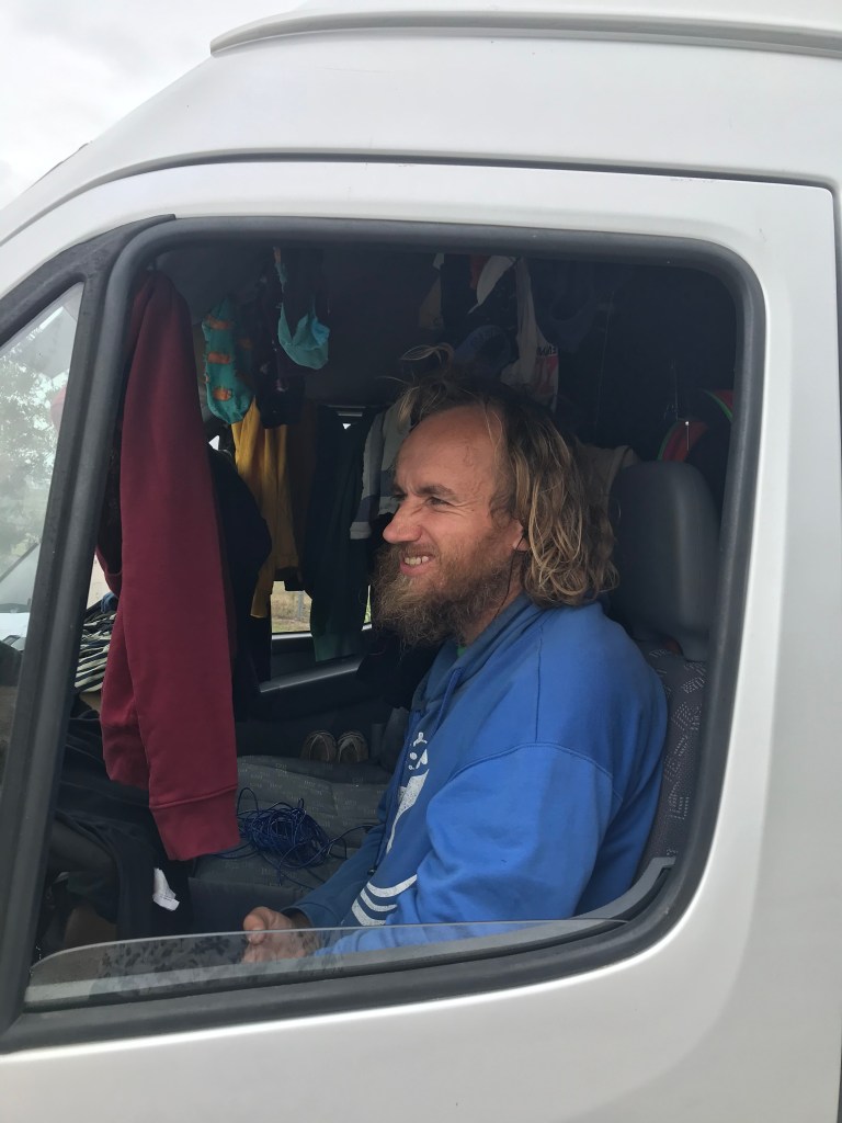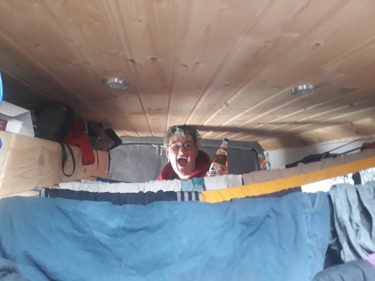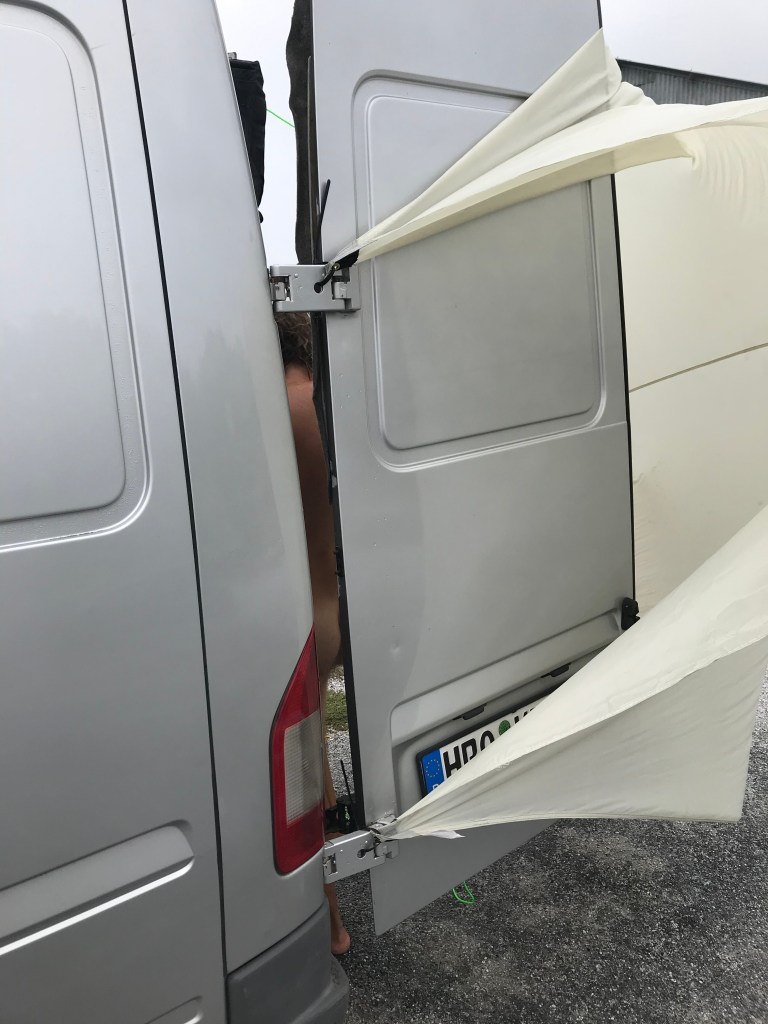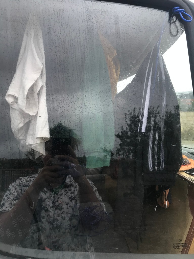 Ein Problem im Vanlife ist das Wäschewaschen – naja, eigentlich bisher nicht. Irgendwo zu einer Waschmaschine – Wäsche rein – Waschen – ab in den Trockner – und Wäsche wieder mitnehmen. Aber wenn der Trockner nicht heizt, wird die Wäsche nicht trocken und wenn es draußen auch nass ist, muss die Wäsche im Auto aufgehangen werden. Und da wir sowohl mal schlafen als auch mal fahren wollten, mussten zwei Lösungen her. Vorne: