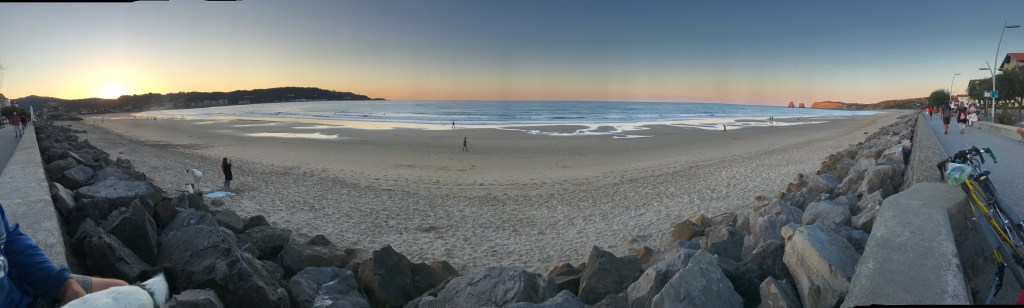 Leider war es mit den Straßenshows in San Sebastian nicht so gut für uns. Und wir waren auch mit unserer Tagesshow nicht so zufrieden – fanden aber auch keinen Platz, um daran wirklich zu arbeiten. So setzten wir uns nach etwa einer Woche in San Sebastian wieder in Bewegung und fuhren die Küste entlang nach Frankreicht. Dort war unser erster Haltepunkt Hendaye genau an der Grenze. Nur war da die Saison ganz offensichtlich zu Ende – außer ein paar älteren Urlaubern und den Surfern am Strand war die Promenade sehr leer. Ein schöner Sonnenuntergang war es trotzdem 🙂