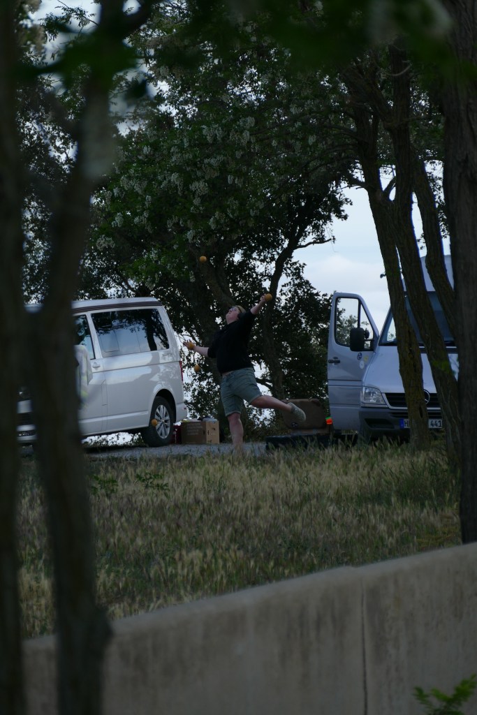 In der Stadt hatten wir einen anderen Camper an uns vorbeifahren sehen – und lustigerweise fanden sie sich als die einzigen anderen kurz nach uns an dem gleichen Parkplatz ein. Und dort war es auch schön, weil es vormittags noch Schatten gab.